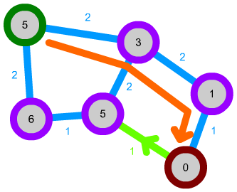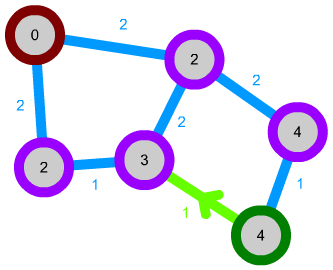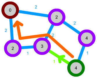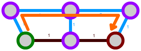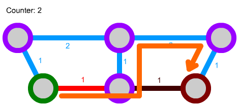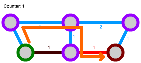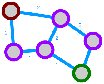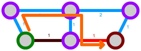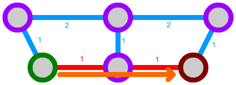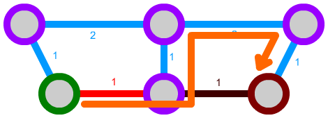 We can also expand this algorithm a bit further. We can, for instance, implement connections that can only be traversed in one direction by not considering them in some cases. Let's say we have the following network. The green path is unidirectional:
