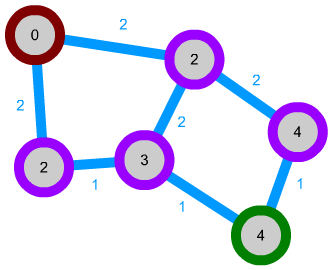 The cost of each node is calculated as the cost of an adjacent node plus its distance to the current one. If there are multiple connections, the cost of the node is simply the lowest cost of all connections. Let's take the following node network as an example (the numbers in blue are the distances):