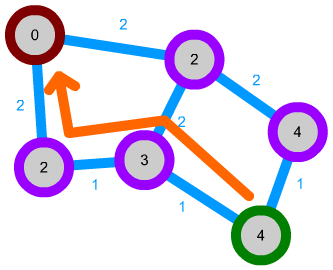 So, with these thoughts in mind, we can move to a more general pathfinding algorithm. The two major changes made from this point onwards are that we no longer want to be confined to a grid, and that we don't want to be limited to some maximum brightness at the destination. In order to facilitate the first change, we use nodes in lieu of a grid, and allow each node to have connections to any number of other nodes. To facilitate the second change, we reverse the "brightness", i.e. a lower "brightness" value means that we're closer to the target. I'll be referring to this value as the "cost" of each node from this point forward.