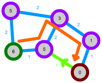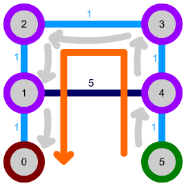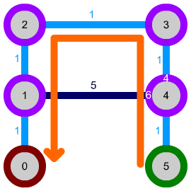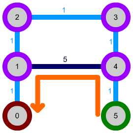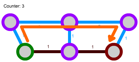 There is a slight pitfall here: because, so far, the path following step simply iterated over all connections of the node to find the one with the lowest-cost node on the other end, we can run into situations where the algorithm crosses the more costly connection despite an easier path around being available: