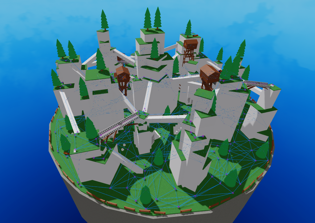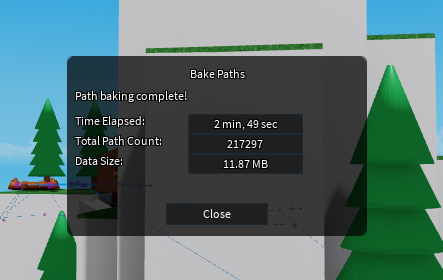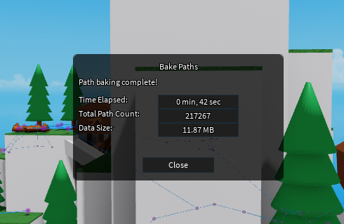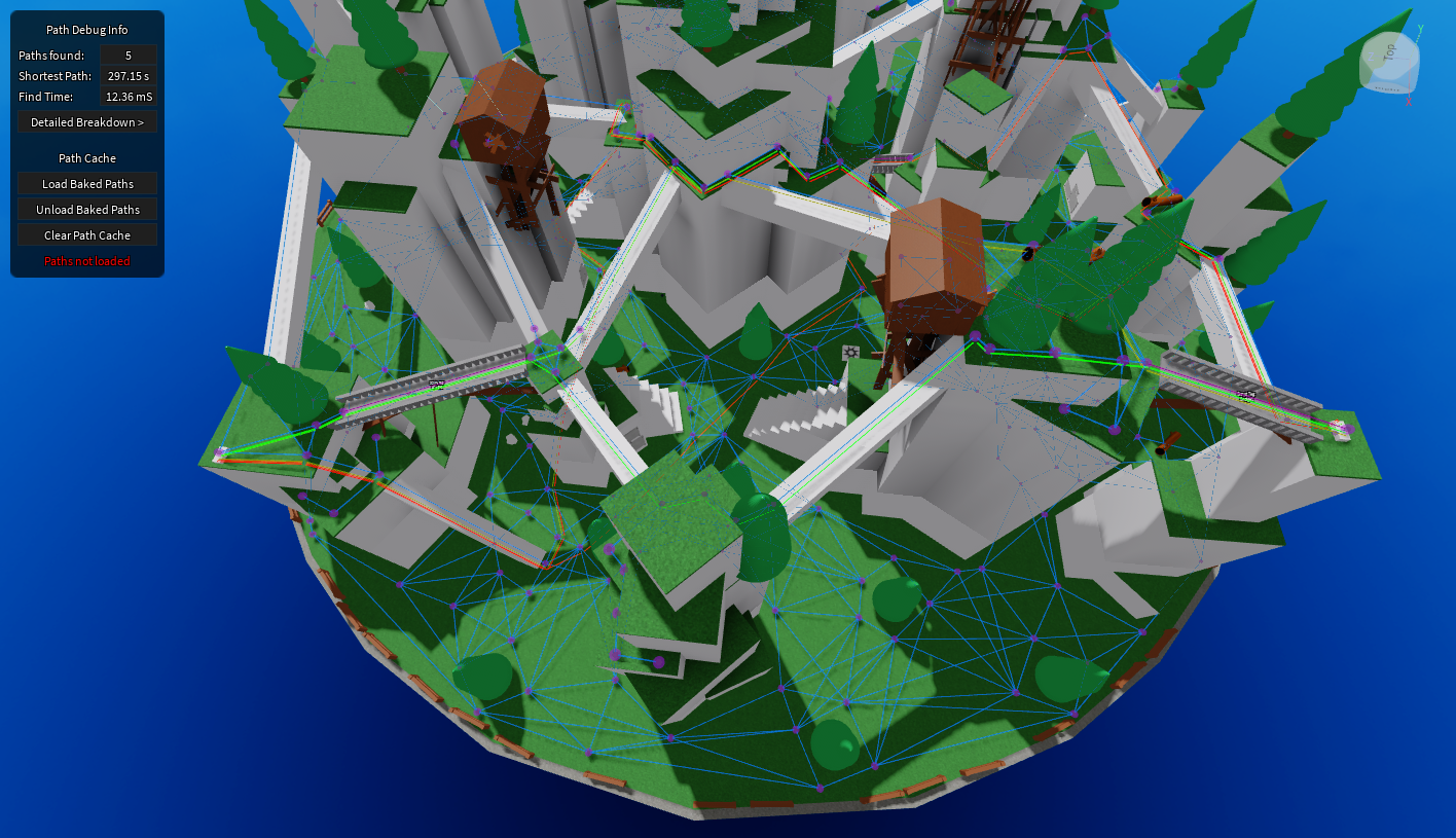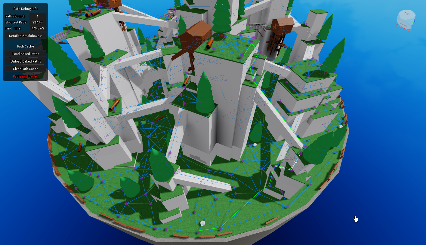 Pathfinding is an expensive operation. Reducing the number of nodes helps, and this node mesh system already beats PathfindingService by a huge margin. However, calculating all possible paths ahead of time and storing them in the game allows us to skip pathfinding altogether. The plugin has a tool built-in for baking paths, and at runtime, this essentially reduces pathfinding to a lookup in a 2D array.