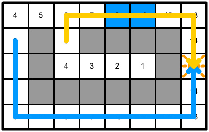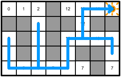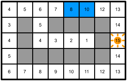 Note how the path in this direction is actually longer than previously (the total path cost is 6 instead of 5). This is because the cost calculation step couldn't use the shorter path across the one-way connection, and so the cost on the far end of that connection ended up being higher than that of the node directly above it, instead of lower. The path following step just went to the next cheapest node as usual.