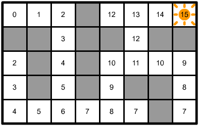So if I'm lost, and want to find my way to the torch, I could do this by looking at which of the surrounding blocks has the highest light level and travel to it, and repeat that process until I reach the torch. Of course, if I start in a cell with no light, that is completely surrounded by darkness, then no path can be found: