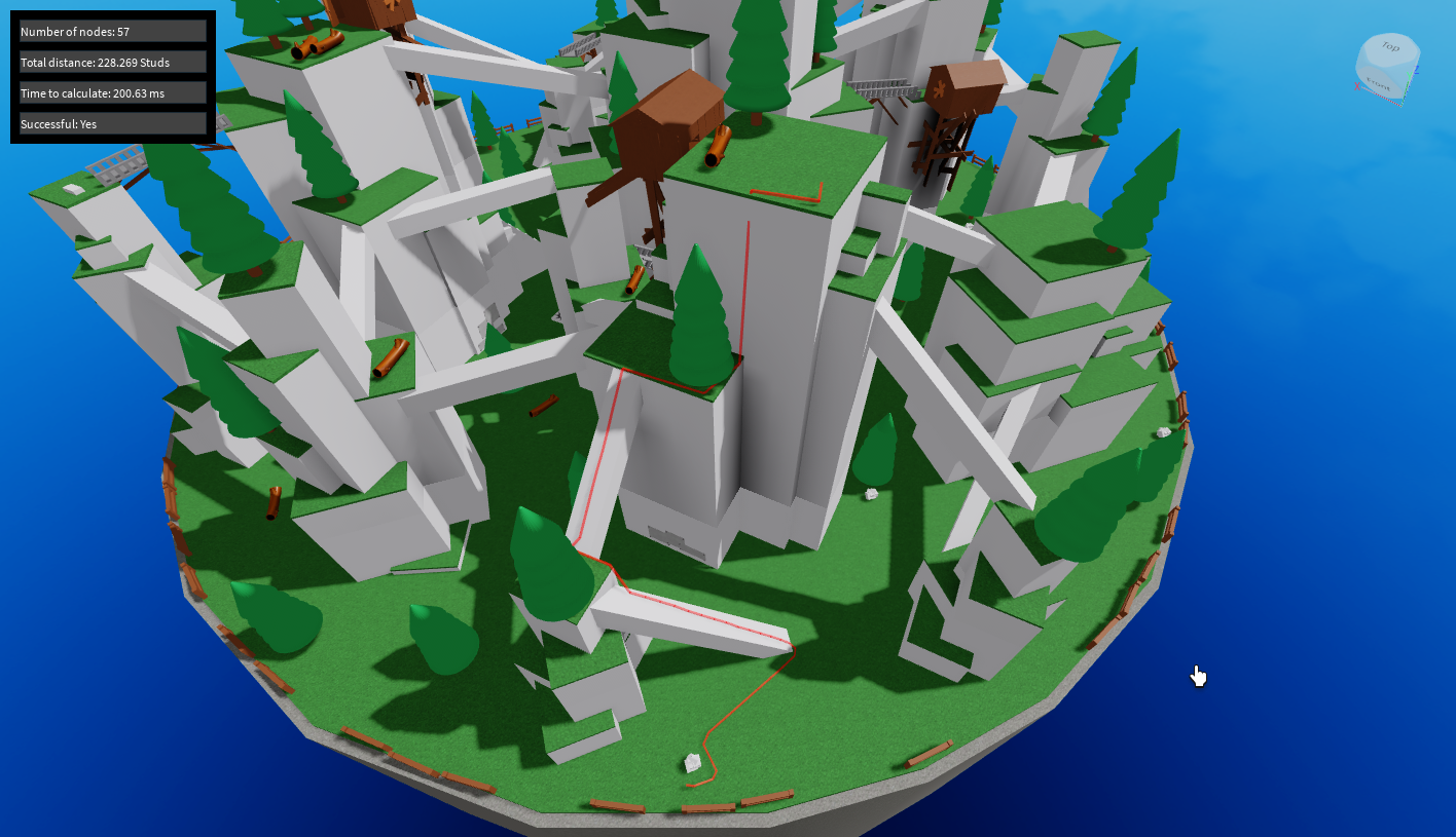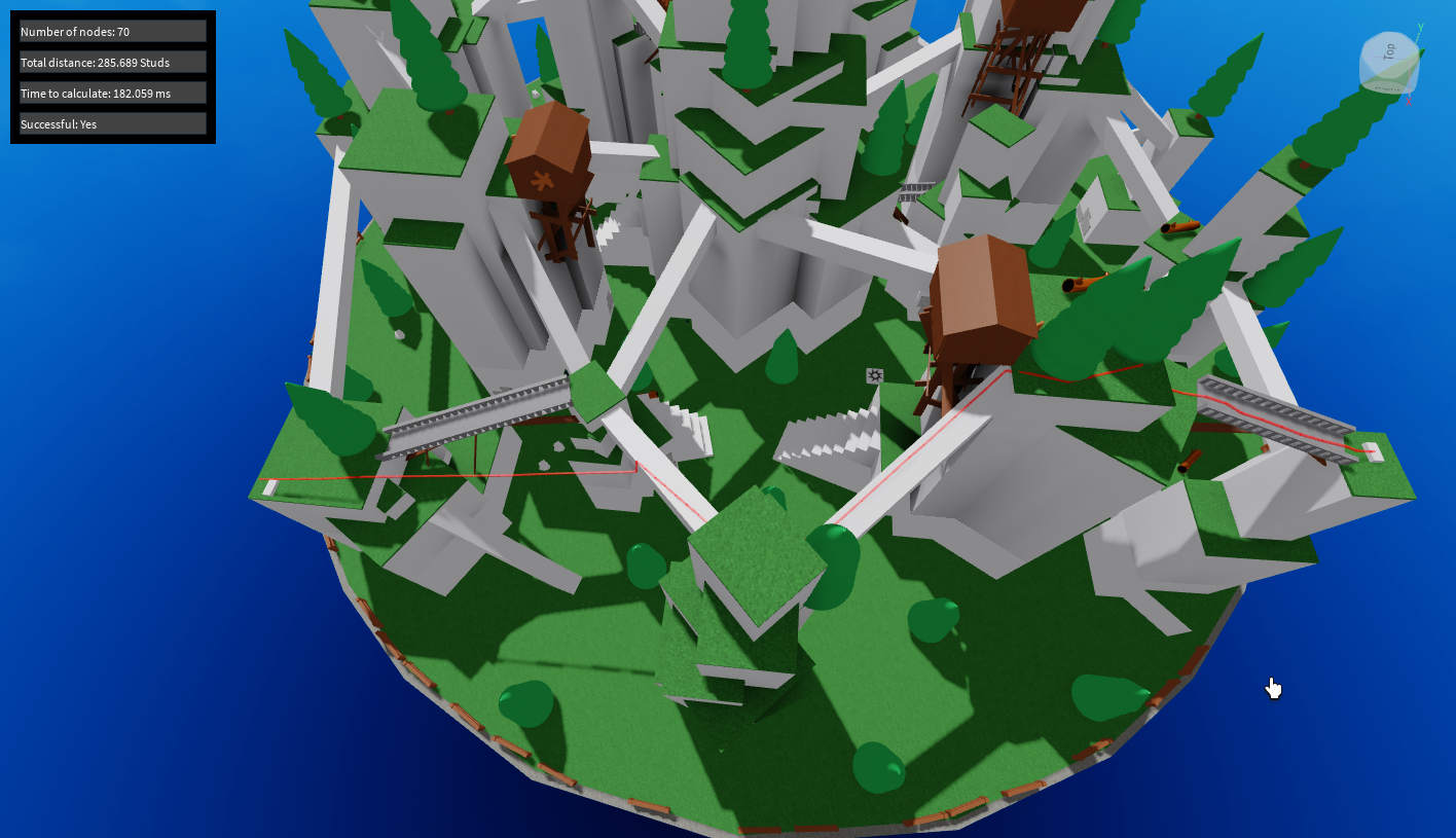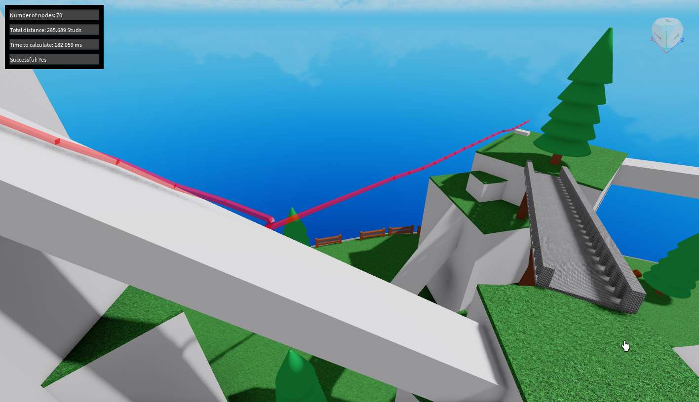 I'd also like to point out the blunder PathfindingService made in the 3rd test, where it deviates from the bridge and would lead an NPC to jump off a cliff, whereas the node system generates paths that are fully traversable. Additionally, in the 2nd test, PathfindingService sends the NPC jumping off of a sizable cliff before finding a more gradual slope to descend.