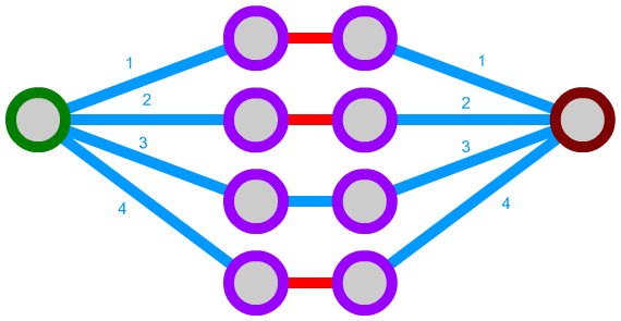 Given a system like this, it may be tempting to start with all connections being open, finding the shortest path, closing the connection it uses, and repeating that process until either no path is found, or the path contains no scriptable connections. This was my original approach as well, but it comes with a serious pitfall when there are several scriptable segments in one path. Let's consider the below node map - disabled connections will be a darker shade of red:
